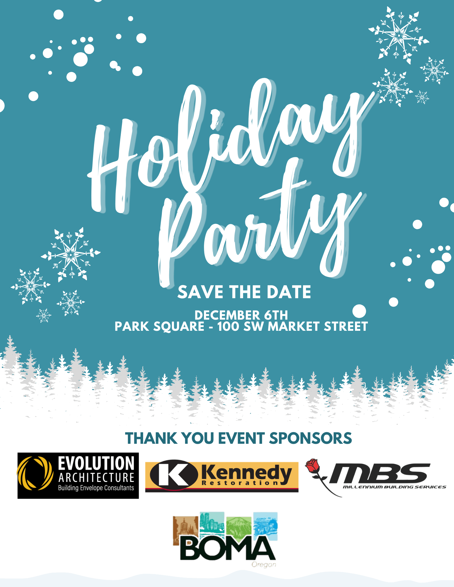 All BOMA Building members are invited to join us for a holiday party hosted by Evolution Architecture, Kennedy Restoration, and Millennium Building Services.